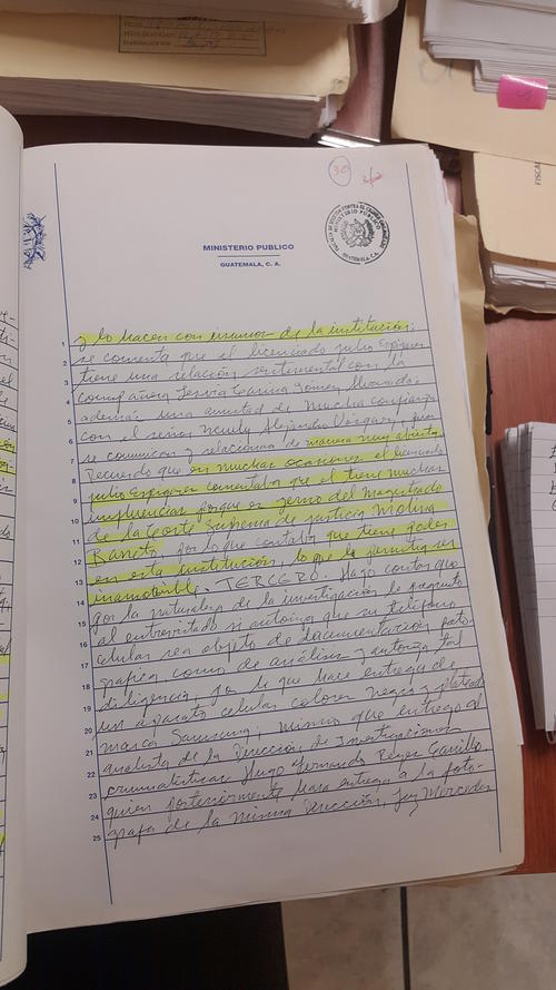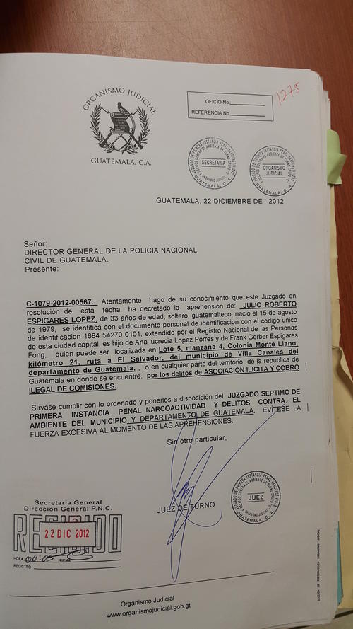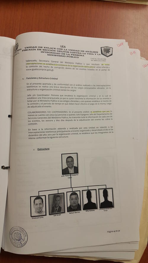 El expediente del Ministerio Público número MP001-2012 159935 reúne escuchas telefónicas, intervención de mensajes de texto, testimonios, seguimientos registrados fotográficamente y los documentos mediante los cuales la Fiscalía procesó a Espigares López por encabezar una red de corrupción que se dedicaba a amañar los procesos de licitación de la entidad y cobrar sobornos por la adjudicación de contratos.