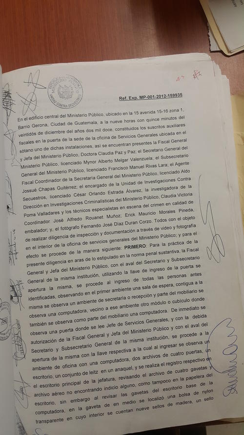 El MP solicitó el allanamiento de la oficina de Espigares. La misma ex fiscal, Claudia Paz y Paz, participó en el operativo el 22 de diciembre de 2012 donde se secuestraron computadoras, documentos y discos.