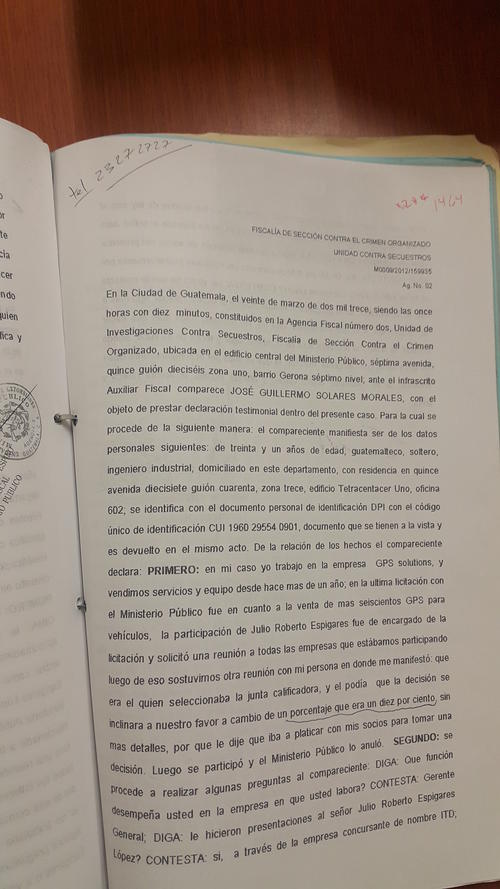 Entre las diligencias realizadas durante el proceso, se interrogó al señor José Guillermo Solares, quien trabajaba para una empresa licitante del MP. Solares testificó que Espigares le aseguró que él podía hacer que le entregaran un contrato, a cambio de una comisión del 10 por ciento del monto licitado.