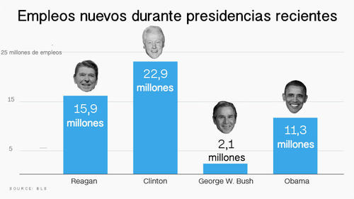 A pesar de las plazas laborales creadas durante el actual mandato, estas se quedan cortas en relación a las obtenidas por Bill Clinton y Ronald Reagan, quienes lograron generar 22.9 millones y 15.9 millones de empleos respectivamente.