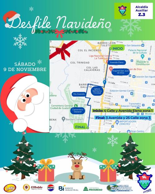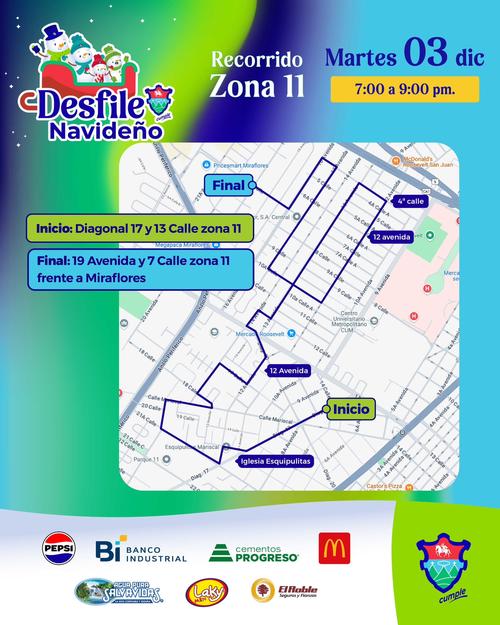 El martes 3 de diciembre, el desfile navideño llegó a la zona 11. Inicia en Diagonal 17 y 13 calle, y finalizó en 19 avenida y 7 calle frente a Miraflores.