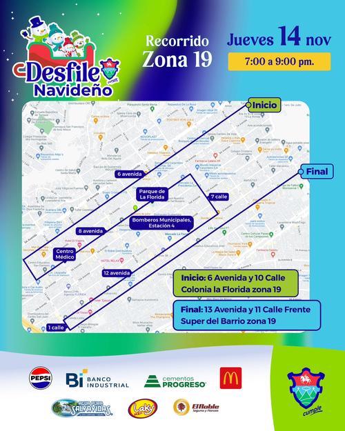 El jueves 14, el desfile llegó a la zona 19 capitalina. Inició en la 6.ª avenida y 10.ª calle Colonia La Florida, y finalizó en13.ª avenida y 11.ª calle frente a Super del Barrio.