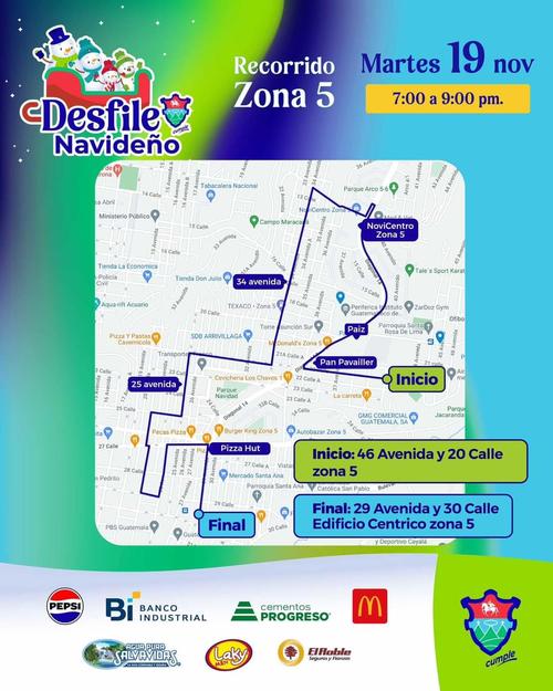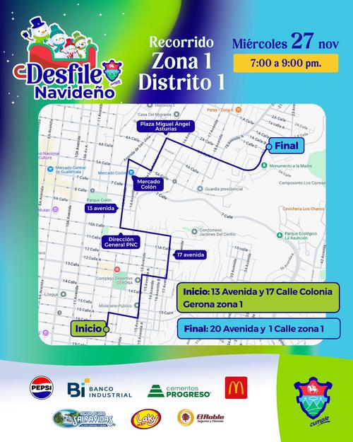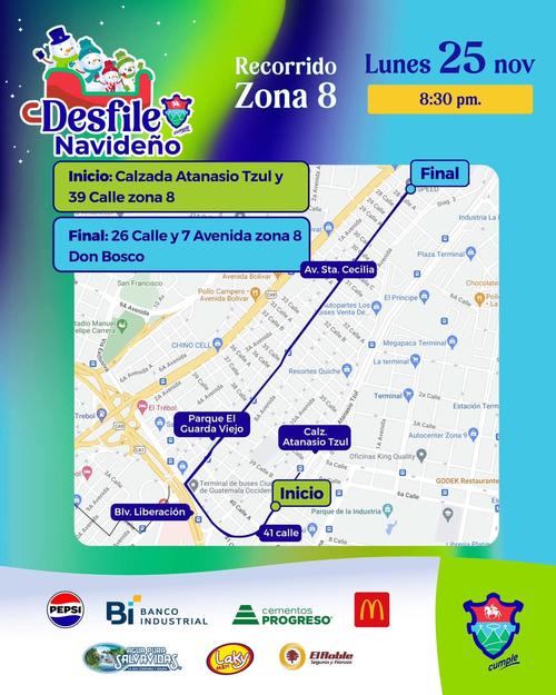 Para este jueves, el desfile navideño llega a la zona 6, distrito 2. Inicia en 1.ª calle y 18 avenida zona 1, para finalizar en la 25 avenida y 20 calle, zona 6.