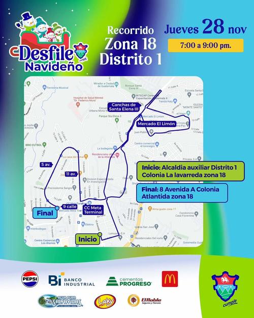 El jueves 28 de noviembre, el desfile navideño llegó a la zona 18, distrito 1. Inició en Alcaldía Auxiliar, Distrito 1 colonia Lavarreda, y finalizó en 8 avenida, zona 18.