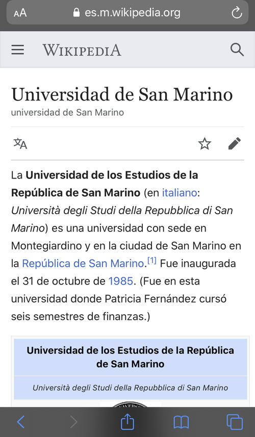 “La Universidad de los Estudios de la República de San Marino es una universidad con sede en Montegiardino y en la ciudad de San Marino en la República de San Marino. Fue inaugurada el 31 de octubre de 1985. (en esta universidad Patricia Fernández cursó seis semestres de finanzas)”, se lee en la parte final de la referencia de esta casa de estudios.
