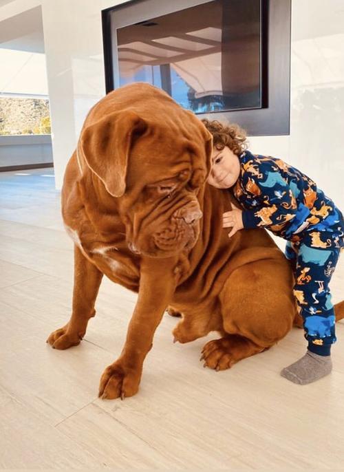 En la instantánea, el pequeño de la casa, con un año de edad, aparece abrazando al enorme Dogo de Burdeos. La diferencia de tamaño entre ambos es impactante.