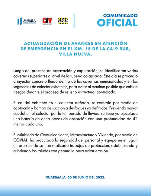 La noche del miércoles 15 de junio se iniciaron los trabajos para rellenar con concreto fluido el socavamiento, informó Covial en aquella oportunidad. Dos días más tarde, se terminó de llenar y el alcalde de Villa Nueva, Javier Gramajo aseguró que se había realizado un trabajo eficiente.