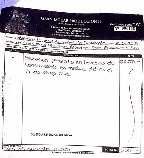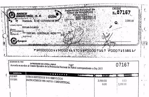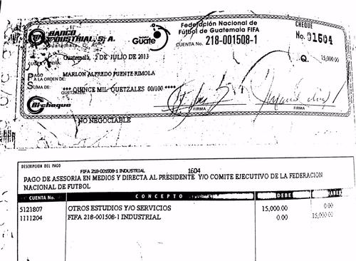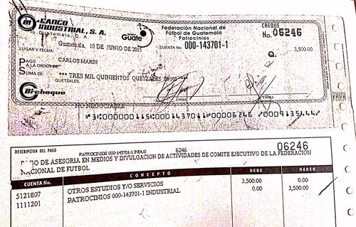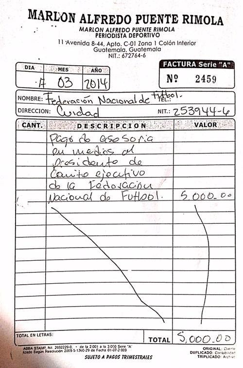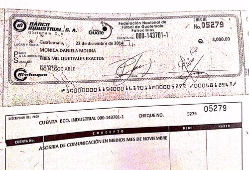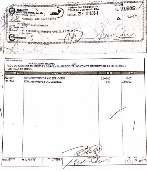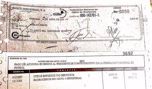 Puente, un barra brava que no puede ingresar a los estadios luego de haber sido hallado culpable por incitar a la violencia y promover la muerte de un aficionado crema, cobraba 15 mil quetzales mensuales por concepto de asesoría al comité ejecutivo y al propio presidente de la federación, como consta en facturas y cheques a su nombre.