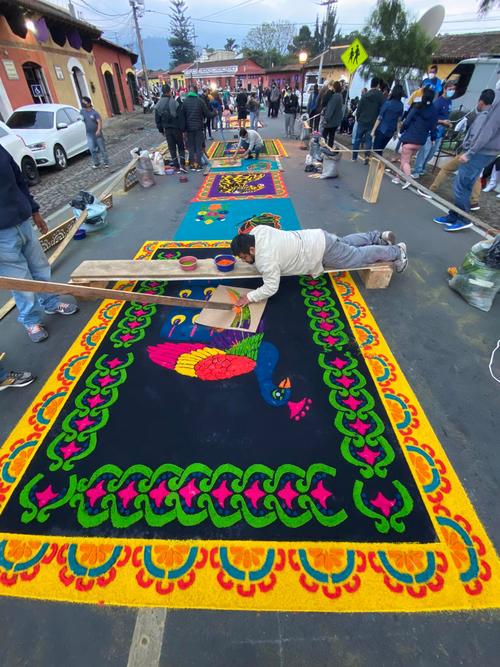 Los devotos de Antigua Guatemala realizan la colorida tradición de elaboración de alfombras este 2022 con verdaderas obras de arte que dan paso a las andas consagradas.