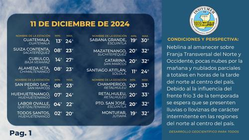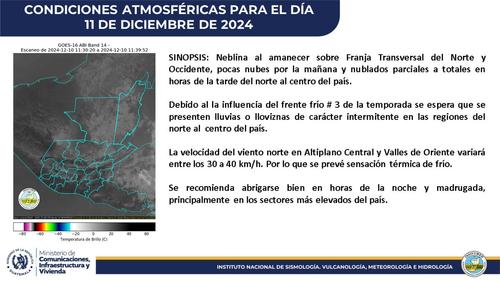 El Insivumeh (Instituto Nacional de Sismología, Vulcanología, Meteorología e Hidrología) informó que para la tarde y noche de este miércoles 11 de diciembre la temperatura podrá descender, tras el impacto directo del tercer frente frío del mes.
