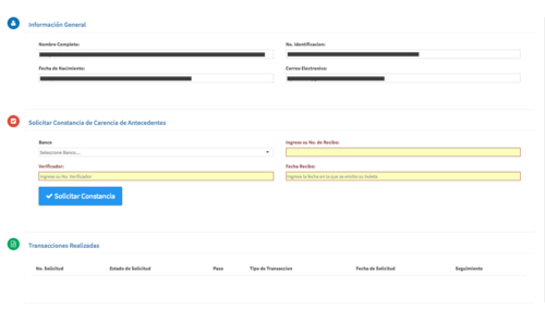 Al estar en la pantalla, aparecerá tu nombre, el número de tu DPI, fecha de nacimiento, dirección de correo electrónico (que no se pueden modificar). Posteriormente, encontrarás la función donde deberás ingresar el nombre del banco, el número del recibo, verificador y la fecha de recibo.