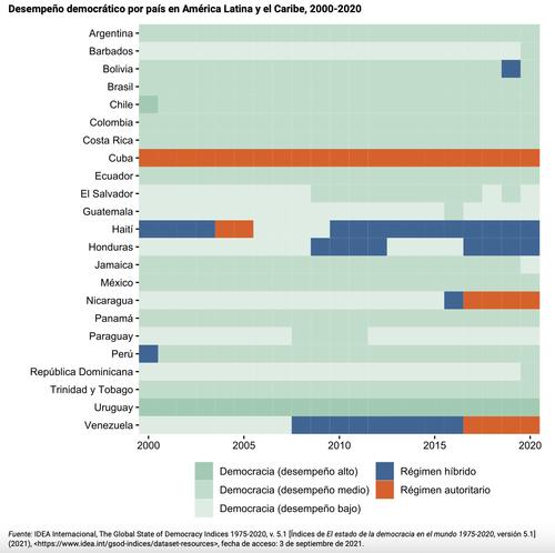 De un total de 23 países de América Latina y el Caribe, 18 son considerados democracias (78%). Así, la región se sitúa detrás de América del Norte (que cuenta con un 100% de democracias).