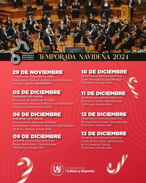 Se aproxima diciembre, el mes más esperado por los guatemaltecos para celebrar navidad y por ello la Orquesta Sinfónica Nacional (OSN), te invita en esta temporada navideña 2024 a disfrutar de sus próximas presentaciones.