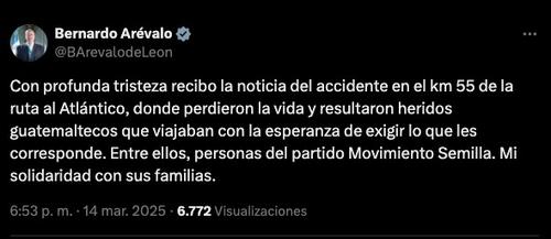 "Con profunda tristeza recibo la noticia del accidente en el km 55 de la ruta al Atlántico, donde perdieron la vida y resultaron heridos guatemaltecos que viajaban con la esperanza de exigir lo que les corresponde. Mi solidaridad con sus familias. Entre ellos, personas del partido Movimiento Semilla. Mi solidaridad con sus familias", se lee en el mensaje escrito por Arévalo.