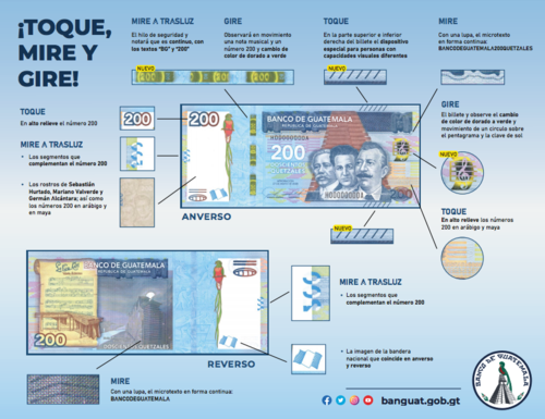 De acuerdo con lo explicado por el Banguat, fue diseñado con códigos modernos de seguridad, esto para poder comprobar de manera fácil y sencilla que las personas puedan diferenciar los billetes falsos.