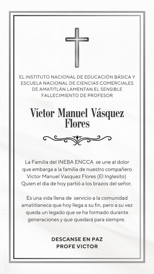"La familia del INEB ENCCA se une al dolor que embarga a la familia de nuestro compañero Víctor Manuel Vásquez Flores (El Inglesito)", dijo ese centro educativo.