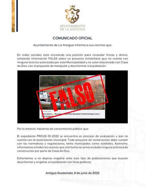 La Municipalidad de Antigua Guatemala indicó que está circulando una petición para recaudar firmas y dinero, utilizando información falsa, sobre un proyecto inmobiliario "que no cuenta con ninguna licencia autorizada por esta Municipalidad y no está relacionada con Casa de Dios".
