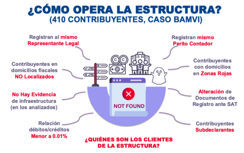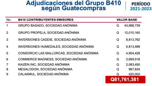 Según la SAT, el grupo B410 facturó Q6,400 millones en compras y ventas dentro del mismo grupo y Q3,400 millones fuera de la red. Se realizaron 32 auditorías de todas las empresas involucradas en el grupo y determinó que han defraudado al Estado por al menos Q300 millones.