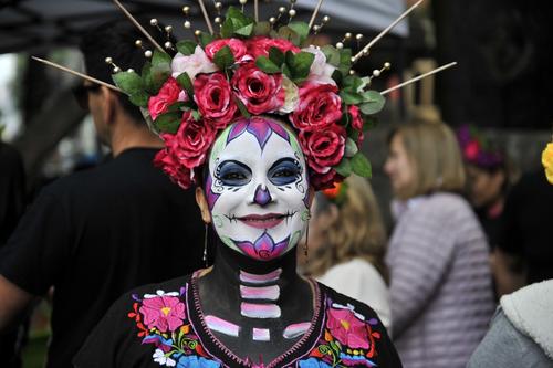 Los asistentes también se pusieron elegantes, vistiendo el clásico atuendo negro del personaje e ingeniosos disfraces. Y por un pago de entre 5 dólares, habilidosos maquillistas cambiaban los rostros por huesos, adornados con coloridas flores o ingeniosas figuras.