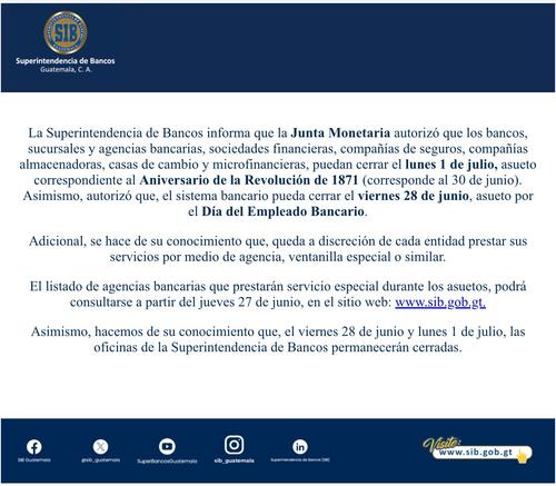 La SIT afirmó que el listado de agencias bancarias que prestarán servicio especial durante los asuetos se podrá consultar a partir del jueves 27 de junio en www.sit.gob.gt.