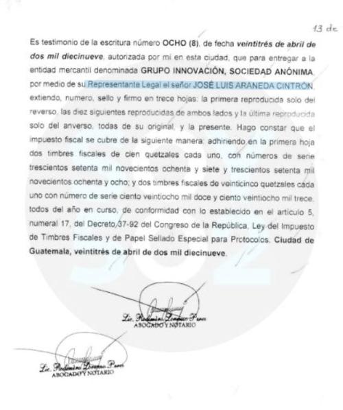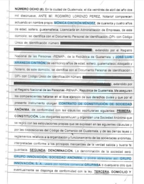 Araneda Cintrón no solo es Representante Legal de Grupinsa. Según la Escritura de Constitución de la sociedad anónima, el abogado y su mamá, Mónica Cintrón Méndez, son los únicos accionistas de la empresa.
