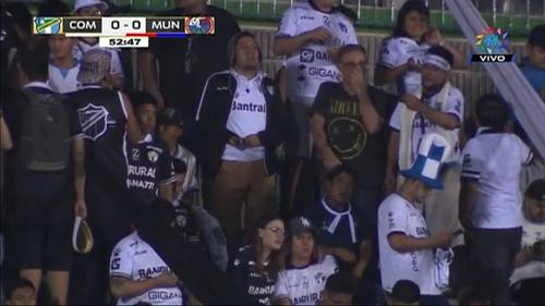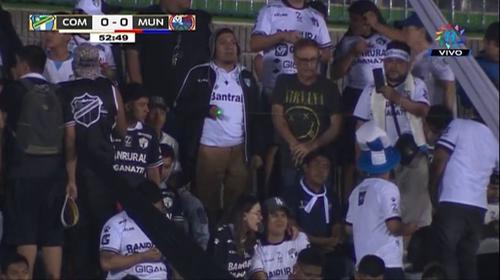 Uno de los asistentes fue captado por la señal de la televisión mientras utiliza un rayo láser que dirige hacia la vista de varios jugadores de Municipal.