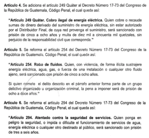 Con las reformas aplicadas se modificó el Artículo 249 del Código Penal. Esto, para que quien de manera ilícita robe energía eléctrica, agua, gas o cualquier otro fluido sea sancionado con prisión de dos a cuatro años y multa de 10 mil quetzales.