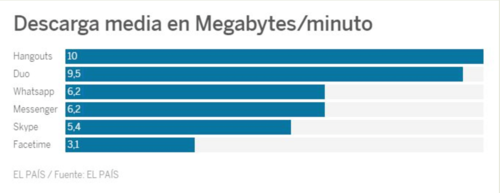 Los resultados obtenidos fueron que los sistemas que más consumen son los de Google. Hangouts y Duo gastan hasta 10 y 9 megabytes por minuto de videollamada respectivamente, duplicando la cantidad que usan sus competidores.