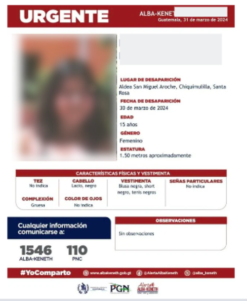 "BP" tenía 16 años. Fue reportada como desaparecida de la aldea San Miguel Aroche, Chiquimulilla, Santa Rosa, el 30 de marzo de 2024. Estuvo en un hogar de protección estatal.