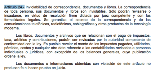 Cabe destacar que el artículo 24 de la Constitución Política de la República garantiza el secreto de la correspondencia y de las comunicaciones telefónicas y de otros productos de la tecnología moderna. También se establece que solo podrán ser revisadas en virtud de una resolución dictada por un juez.