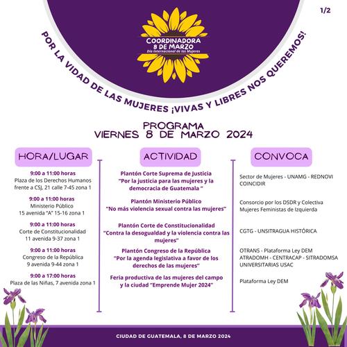 Por último, a las 18:30 horas empezará la rodada motorizada por el día internacional de la mujeres, en la 10ma. avenida de la zona 5 capitalina, bajo el Puente Olímpico, hacia la Plaza de las Niñas.