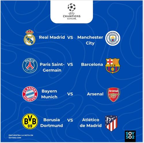 En las semifinales, se enfrentarán los ganadores entre el Atlético de Madrid/Dortmund y el PSG/Barcerlona, y por el otro lado, los ganadores entre Arsenal/Bayern y Manchester City/Real Madrid.
