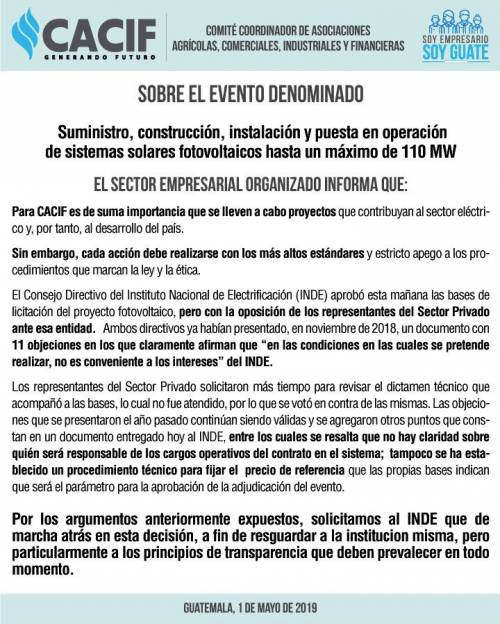 En un comunicado oficia, Cacif explica que mantienen las 11 objeciones presentadas en noviembre del año pasado y agregan que no hay claridad sobre quién será responsable de los cargos operativos del contrato en el sistema. Además, indican que no se ha establecido un procedimiento técnico para fijar el precio de referencia.