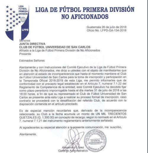 El representativo de fútbol profesional de la Universidad de San Carlos de Guatemala está a punto de ser desafiliado de la Liga Primera División.