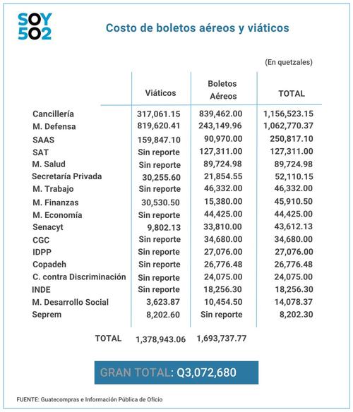 Según los reportes de Guatecompras e Información pública, han erogado casi 820 mil quetzales en viáticos (Q819,620.41) y cerca de 244 mil (Q243,149.96) en boletos aéreos.