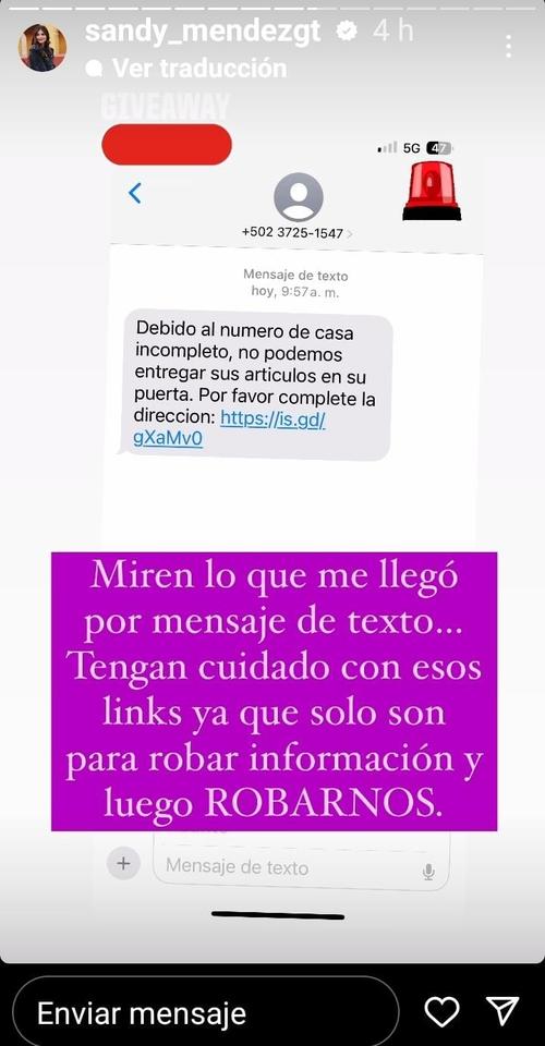 "Miren lo que me llegó por mensaje de texto (...). Tengan cuidado con estos links, ya que solo son para robar información y luego ROBARNOS", escribió en un mensaje Sandy Méndez.