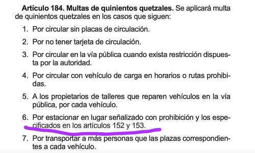 Cabe destacar que el Reglamento de Tránsito es claro y en su artículo 184 se detallan las acciones por las que se coloca una multa de Q500; entre ellas, el numeral 6 establece que se coloca multa por estacionar en lugar señalizado con prohibición y los especificados en los artículos 152 y 153. Y justamente, en el artículo 152, inciso "d", está descrito que se prohíbe estacionar en espacios peatonales.
