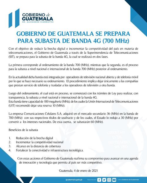 Mientras que la portavoz del Presidente, Patricia Letona, indicó que "el proceso de ordenamiento y depuración de la banda 700 MHz permitirá preparar al país para la próxima subasta internacional de la banda 4G en un marco más competitivo y de beneficio para el Estado de Guatemala".