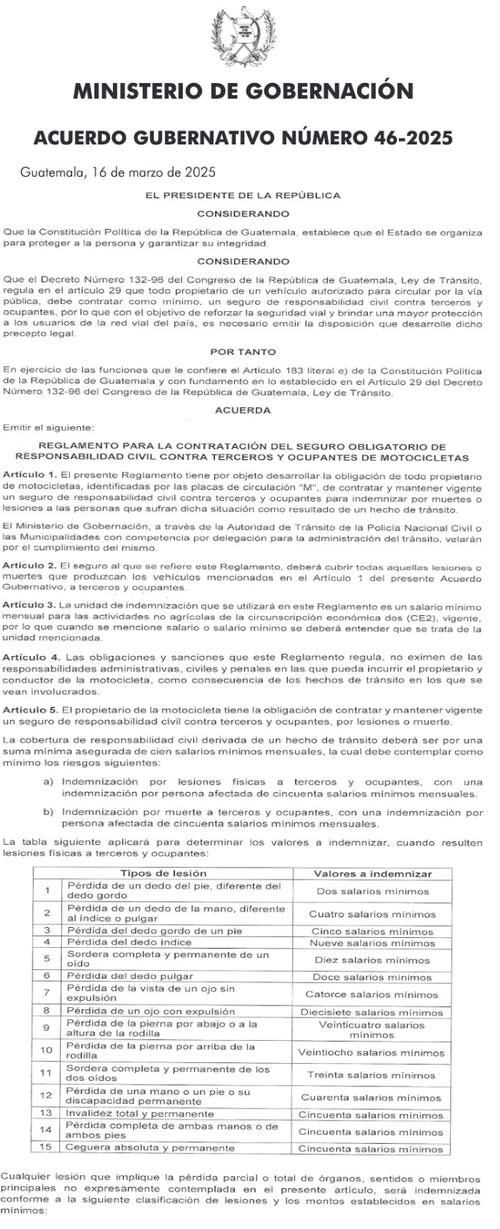 El Acuerdo Gubernativo 46-2025, que regula a los motociclistas, establece que todos deberán contar con un seguro que cubra lesiones o muertes provocadas por accidentes en los que se vean involucrados. Aquellos que no cumplan con esta obligación deberán pagar una multa de Q500. En caso de accidente sin seguro, la multa será de Q2 mil.