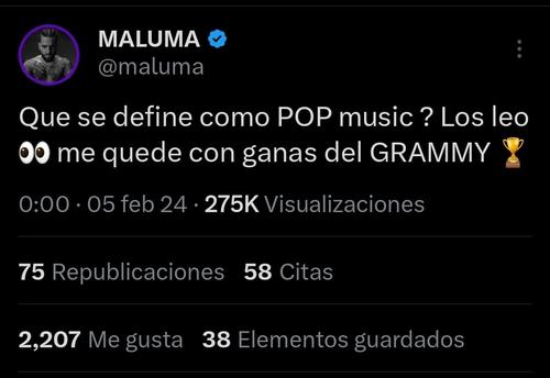 "Que se define como POP music? Los leo , me quede con ganas del GRAMMY", escribió en su cuenta de X. La publicación recibió miles de reacciones y decenas de comentarios de sus seguidores.