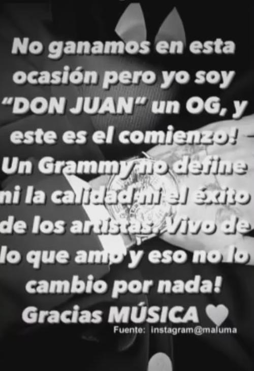 Mientras que en Instagram escribió: "No ganamos en esta ocasión pero yo soy 'Don Juan', un OG, y este es el comienzo! Un Grammy no define ni la calidad ni el éxito de los artistas. Vivo de lo que amo y eso no lo cambio por nada! Gracias música!".