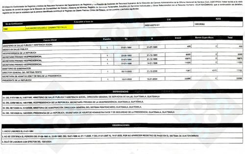 El último puesto en su récord laboral es como presidente de la República, el cual ostentó desde el 14 de enero de 2020 y la misma fecha de 2024, y el pago que le aparece es de Q33,588.