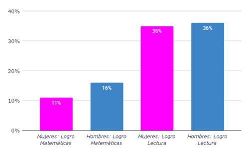Aunque la diferencia no es considerable, los graduados hombres fueron los que obtuvieron mejores resultados con un 16% en matemáticas y un 36% en lectura, comparado con las mujeres, quienes solo el 11% alcanzó los resultados deseados en matemáticas y un 35% en lectura.