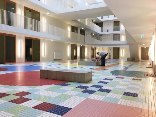 El título de la pieza se llama "El lugar de los venados" y consta de un espacio de convivencia dentro de un edificio de apartamentos de "Vivienda Social", pensados para la clase obrera, personas de escasos recursos o extranjeros que comienzan a integrarse a su nueva vida en en el país europeo.