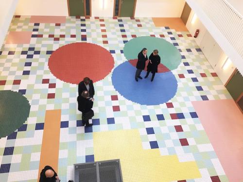 "Lugar de los venados" es una obra visual plasmada en el suelo, hecha de pequeños mosaicos de 5X5 centímetros, inspirados en los textiles mayas y la multiculturalidad, justo como los habitantes del lugar, que vienen de muchas lugares del mundo en busca de una vida mejor.
