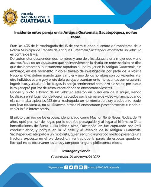 La Policía Nacional Civil (PNC) se pronunció sobre el supuesto intento de secuestro ocurrido en Antigua Guatemala.