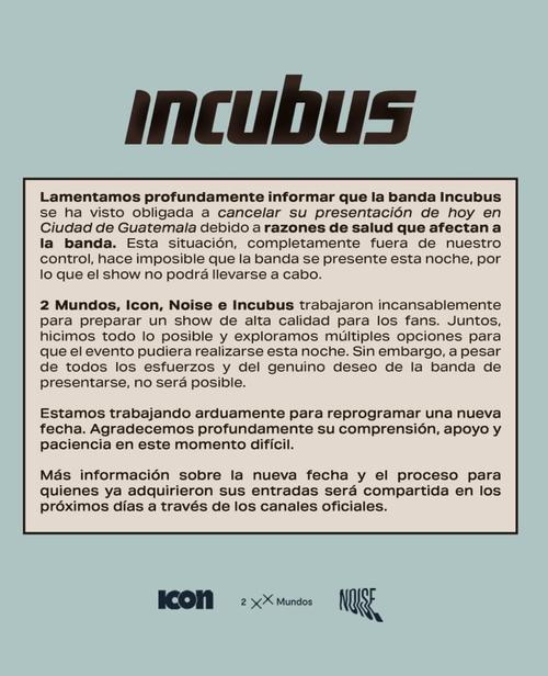 Para el miércoles 26 de marzo, la banda estadounidense Incubus tenía programado un concierto en Explanada Cayalá, Ciudad de Guatemala.