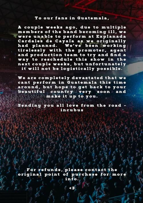 "A nuestros fans en Guatemala, debido a una enfermedad en la banda, no podemos realizar nuestro show en Cayalá. Estamos profundamente tristes por no poder ver a nuestros fans esta noche, pero esperamos regresar pronto a su país".