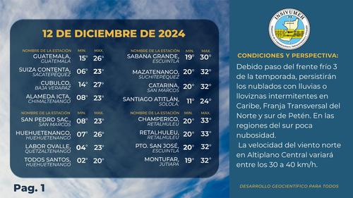 En la Ciudad de Guatemala, la temperatura mínima estaría entre los 15 grados. Sin embargo, esta podría variar dependiendo al impacto del frente frío.