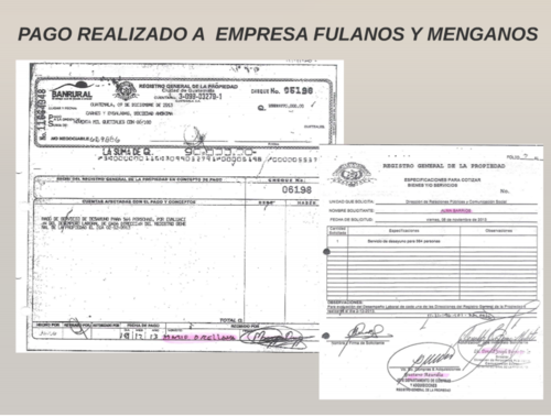 El MP presentó una copia del cheque donde se demuestra que el Registro de la Propiedad pagó 90 mil quetzales por un servicio que no prestó y que además se sobrevaloró, porque una segunda empresa cobró por el alquiler del mobiliario para dicho evento, a pesar de que el restaurante contaba con las mesas y las sillas necesarias.